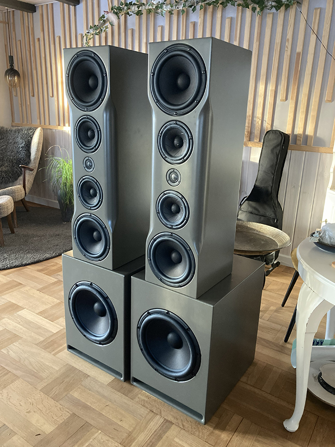 Nedenunder til venstre, et unik custom-designet 4-vejs aktive højttaleresystem med Scan Speak enheder inklusive deres beryllium diskant. Nedenunder til højre, et “yet-to-be-released” ret utrolige og high-end serie af aktive højttalere i kulfiber – stay tuned!